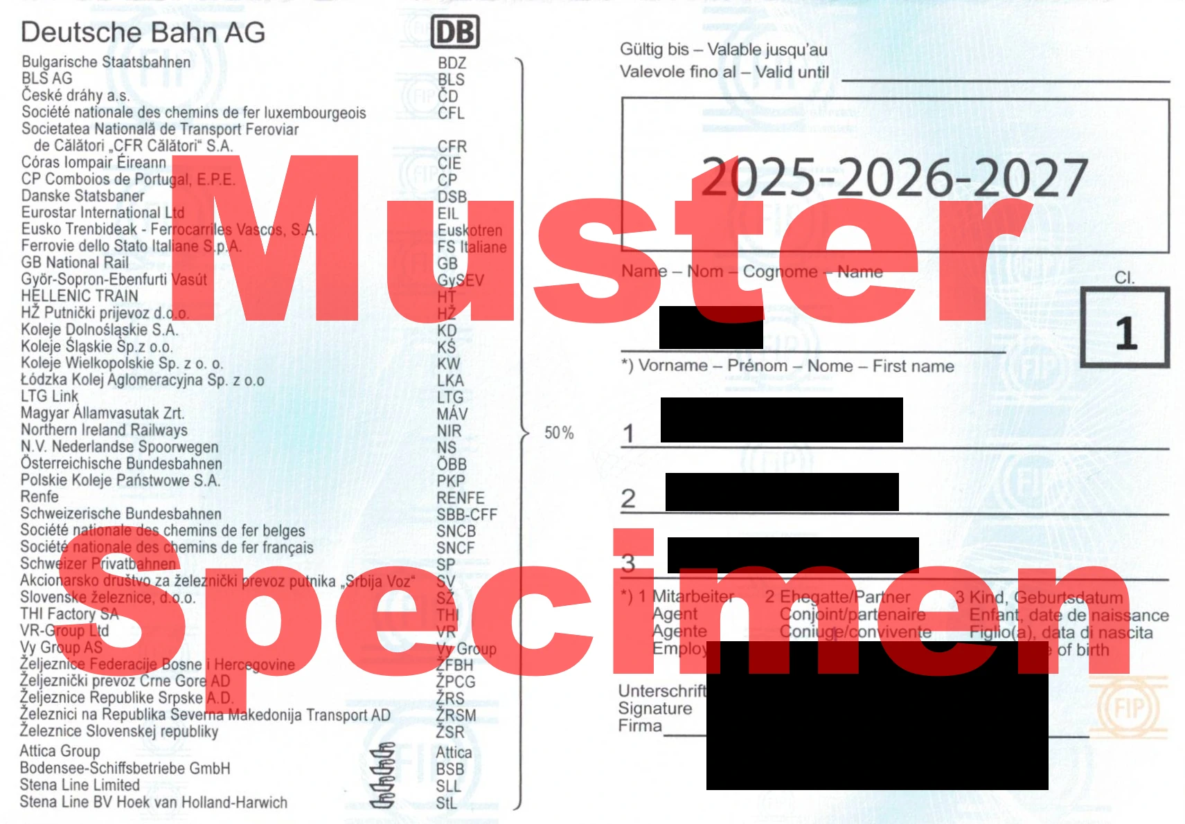 Selon vos besoins, des Coupons FIP avec 1 à 4 champs par membre FIP peuvent être demandés. Chaque champ vous autorise à un nombre illimité de voyages sur le réseau de l’entreprise ferroviaire ou maritime respective le jour indiqué et le jour suivant.